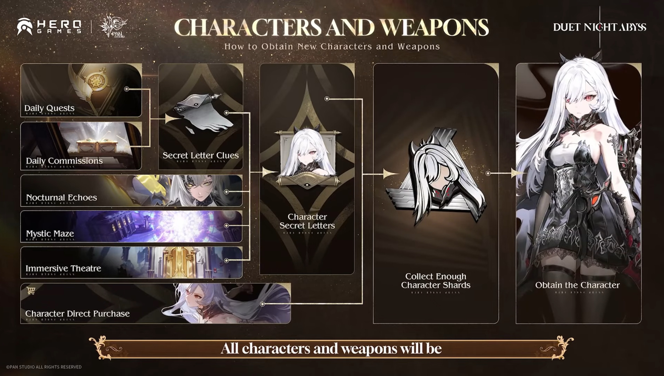 Characters and weapons can be obtained through commission system or purchased directly from shop!