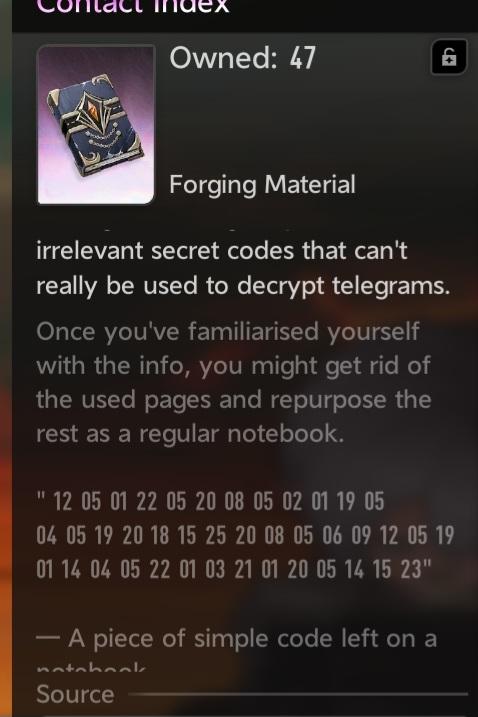 So i decoded the game's "Contact index" item's code. Its basically the numbers equal the letter of the english alphabet.